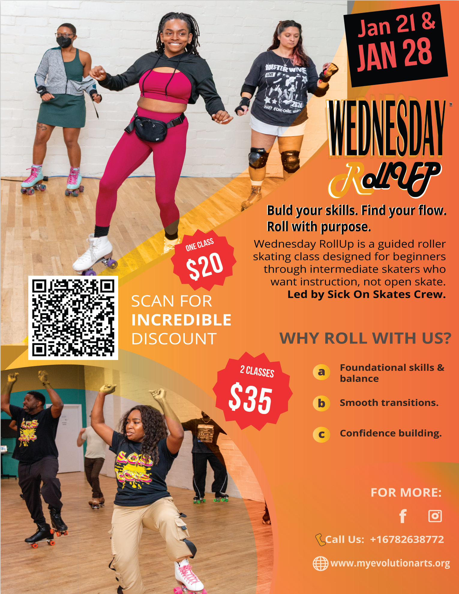 Wednesday RollUp is a guided roller skating class designed for beginners through intermediate skaters who want instruction, not open skate. Led by Sick On Skates Crew, this structured class focuses on building a strong foundation and developing confidence on wheels.